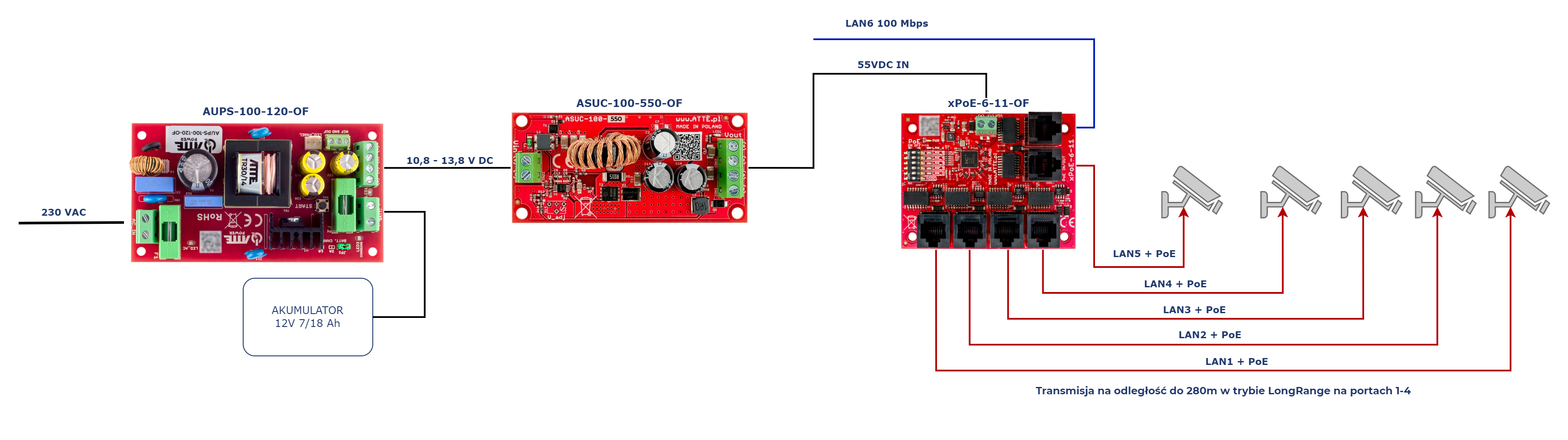 Przykładowe zastosowanie ASUC-100-550-OF do zasilenia 5 kamer IP PoE