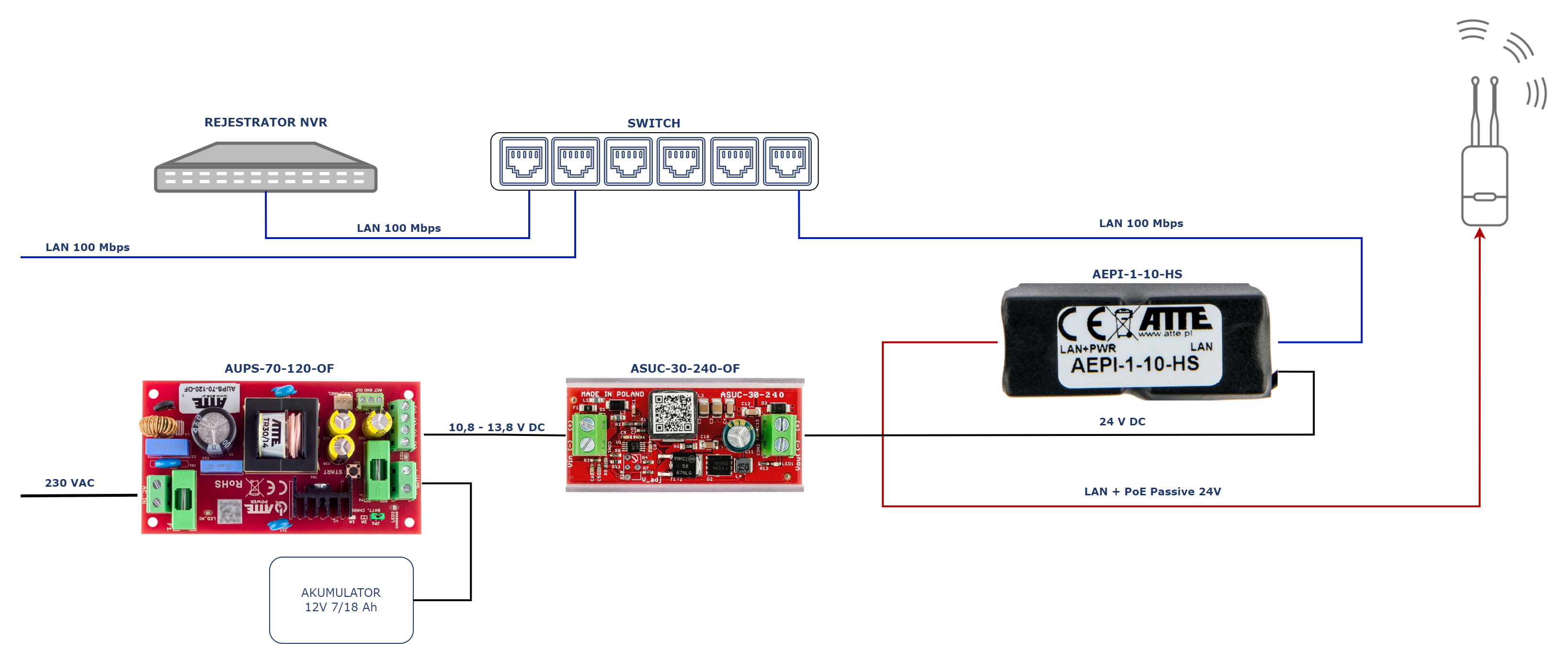 Przykładowe zastosowanie ASUC-30-240-OF do zasilania jednego punktu dostępu