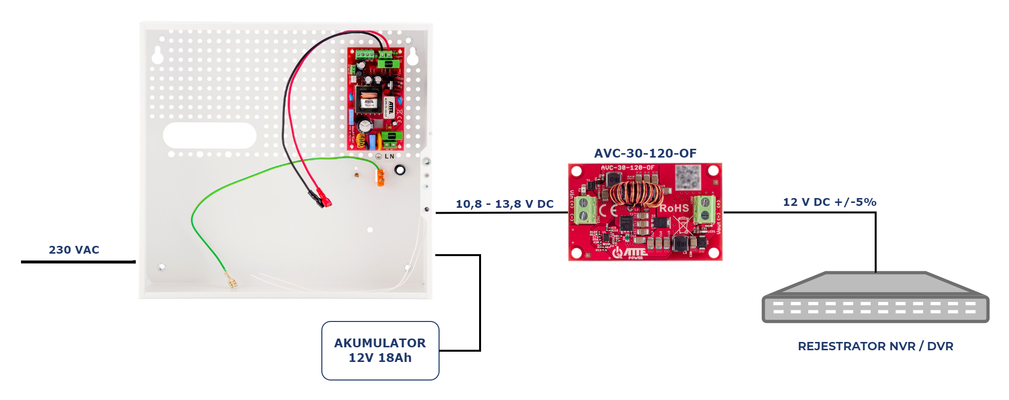 Przykład zastosowania zasilacza buforowego w połączeniu z modułem AVC-30-120-OF do zasilania rejestratora z podtrzymaniem zasilania