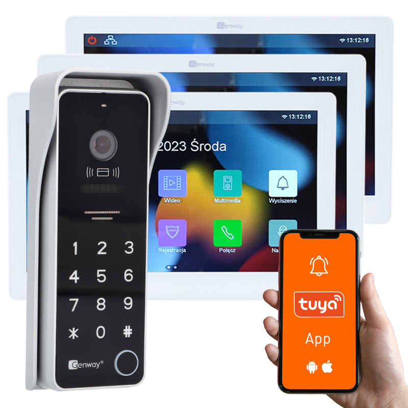 Genway F-S9-V14-2W-3 - Zestaw wideodomofonowy 2 żyłowy 3 monitory 10" WiFi Tuya
