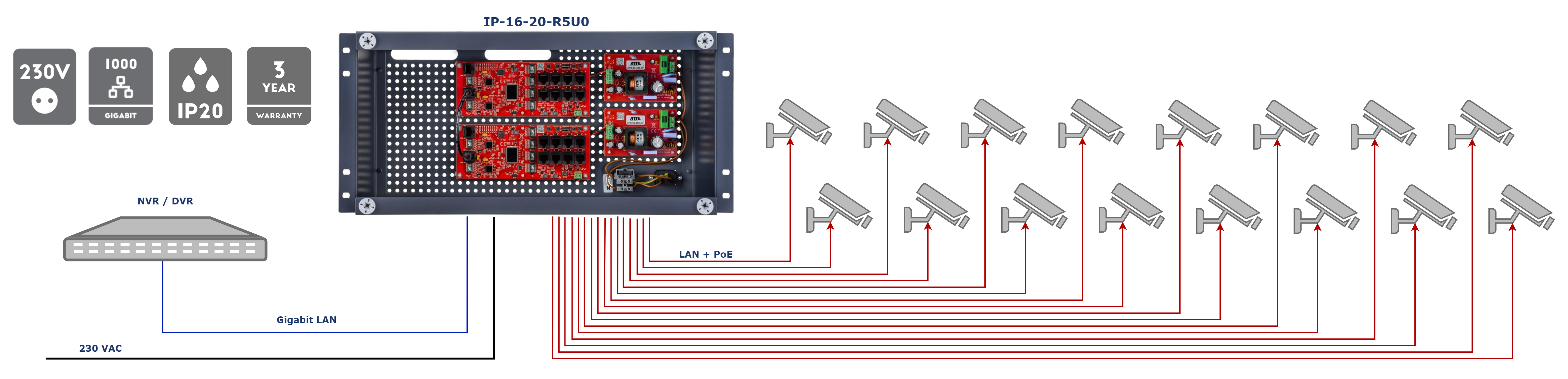 IP-16-20-R5U0 to gotowy zestaw, dedykowany do zasilania systemu telewizji przemysłowej IP składającego się z 16 kamer IP. Elektroniczne zabezpieczenia wyjść PoE zapewniają ciągłość pracy całego systemu przy zwarciu, lub przeciążeniu pojedynczych gałęzi zasilania, oraz automatyczny powrót napięcia po ustąpięniu awarii. Urządzenie znajduje zastosowanie w systemach wymagających zwiększonej przepustowości sieci takich jak monitoring CCTV 4K Ultra HD. Niezarządzalne switche PoE z zasilaczem serii IP przeznaczone są do współpracy z kamerami IP oraz innymi urządzeniami sieciowymi zasilanymi w standardzie PoE 802.3at/af oraz PoE PASSIVE.