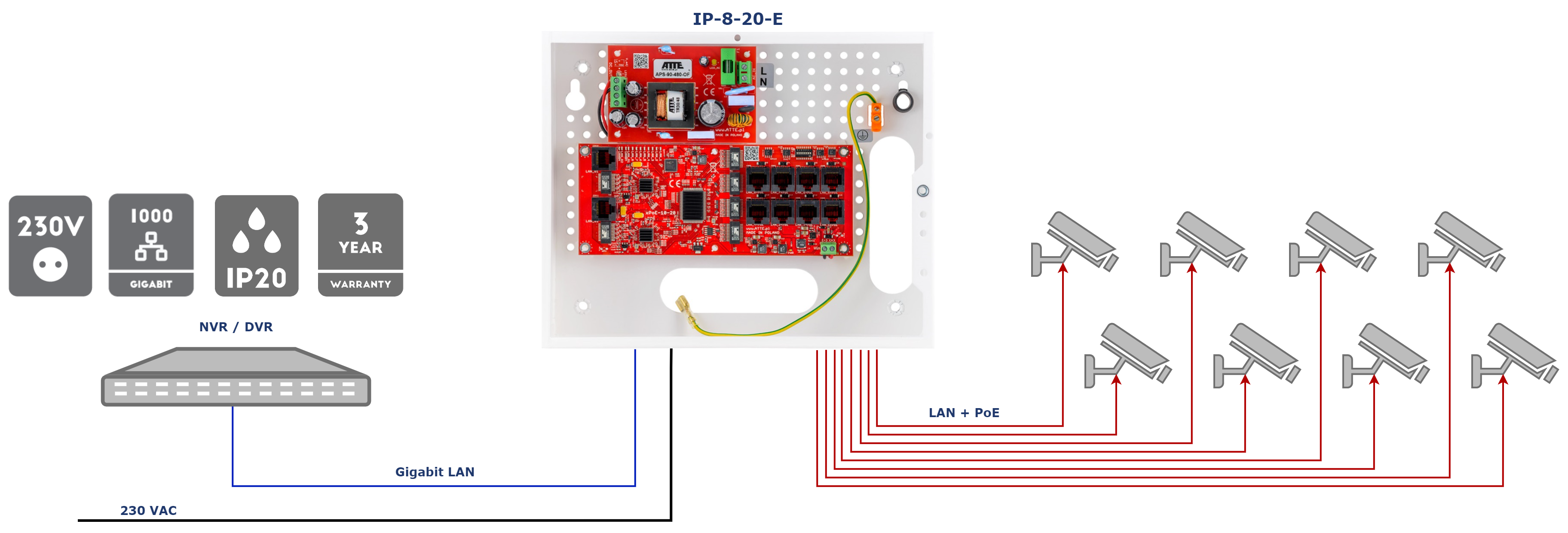 IP-8-20-E to gotowy zestaw, dedykowany do zasilania systemu telewizji przemysłowej IP składającego się z 8 kamer IP. Elektroniczne zabezpieczenia wyjść PoE zapewniają ciągłość pracy całego systemu przy zwarciu, lub przeciążeniu pojedynczych gałęzi zasilania, oraz automatyczny powrót napięcia po ustąpięniu awarii. Urządzenie znajduje zastosowanie w systemach wymagających zwiększonej przepustowości sieci takich jak monitoring CCTV 4K Ultra HD.