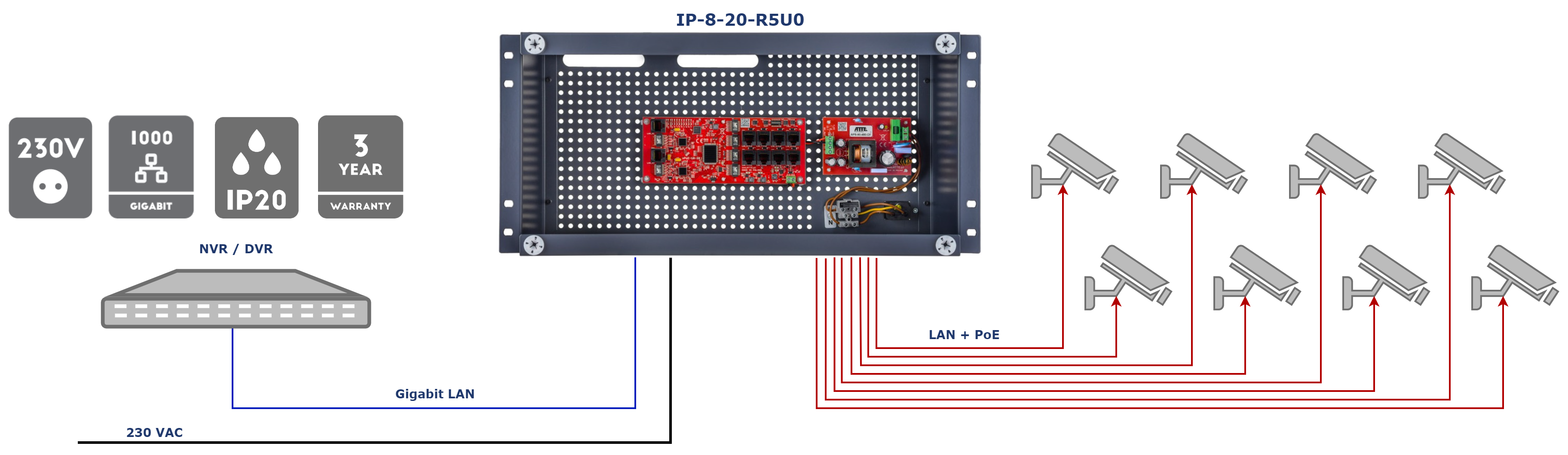 IP-8-20-R5U0 to gotowy zestaw, dedykowany do zasilania systemu telewizji przemysłowej IP składającego się z 8 kamer IP. Elektroniczne zabezpieczenia wyjść PoE zapewniają ciągłość pracy całego systemu przy zwarciu, lub przeciążeniu pojedynczych gałęzi zasilania, oraz automatyczny powrót napięcia po ustąpięniu awarii. Urządzenie znajduje zastosowanie w systemach wymagających zwiększonej przepustowości sieci takich jak monitoring CCTV 4K Ultra HD.