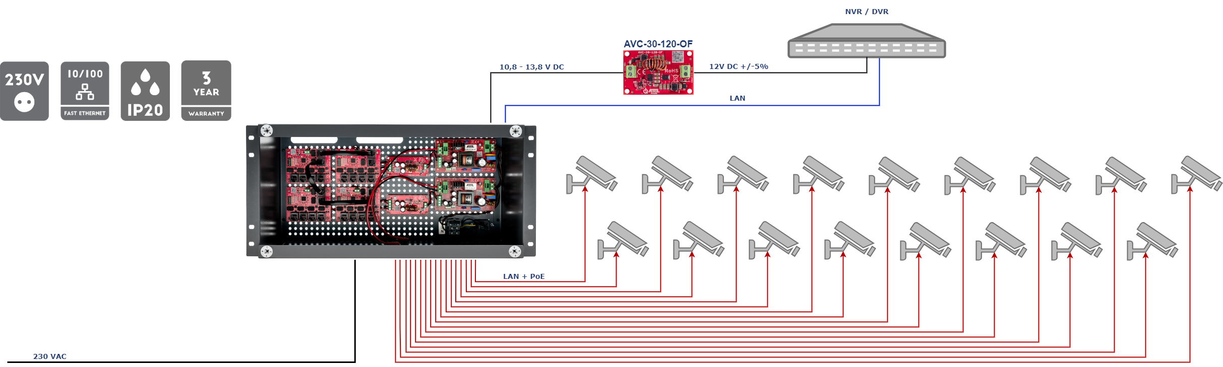 Przykładowe zastosowanie zestawu IPUPS-17-11-R5U0 do zasilenia rejestratora razem z 17 kamerami IP PoE