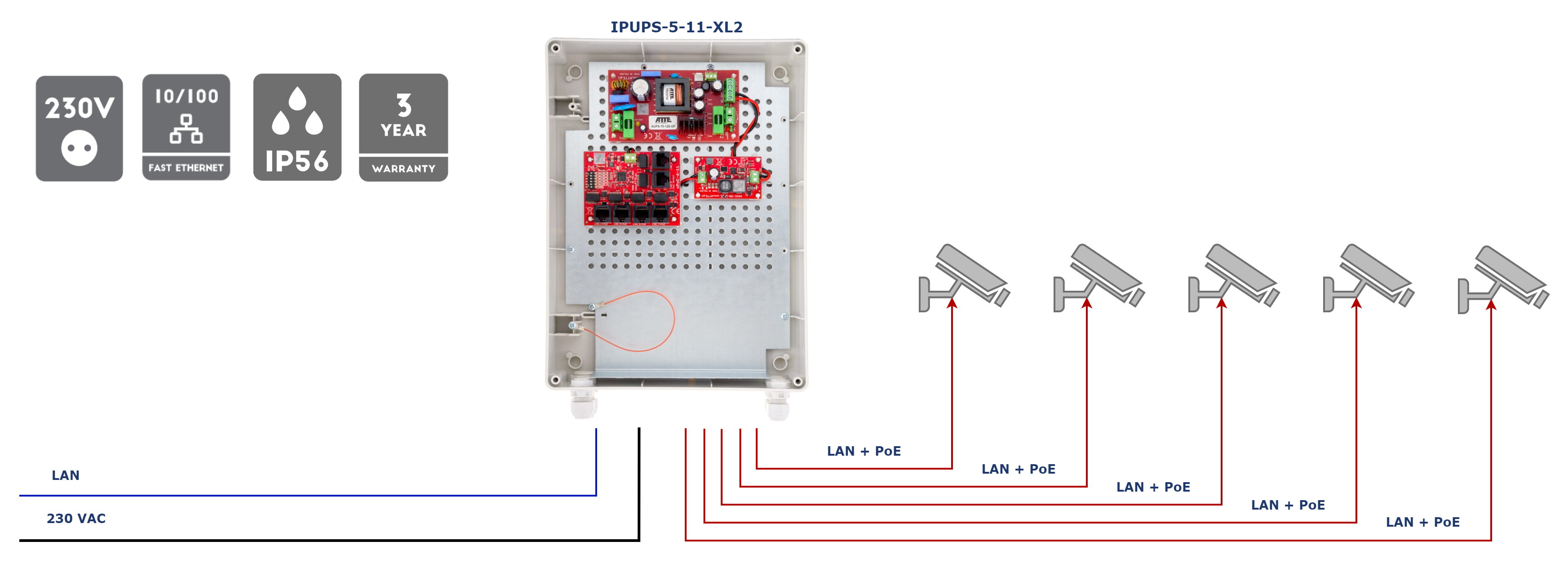 Uwagi: brak akumulatora w zestawie IPUPS-5-11-XL2 to gotowy zestaw, dedykowany do buforowego zasilania systemu telewizji przemysłowej IP składającego się z 5 kamer IP. Elektroniczne zabezpieczenia wyjść PoE zapewniają ciągłość pracy całego systemu przy zwarciu, lub przeciążeniu pojedynczych gałęzi zasilania, oraz automatyczny powrót napięcia po ustąpięniu awarii.