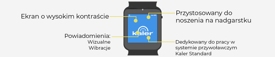 Odbiornik-pager KLR-WW to bezprzewodowy zegarek, który pełni funkcję odbiornika powiadomień w systemie przywoławczym Kaler Long Range. Odbiornik posiada kontrastowy ekran, na którym wyświetla wezwanie lub aktualną godzinę. Jest w stanie obsłużyć do 9999 nadajników. Zegarek informuje o przywołaniu migającą diodą LED, brzęczykiem i wibracjami. Zasięg do 1000 metrów w otwartej przestrzeni pozwala na pokrycie znacznego obszaru działania. Wbudowana bateria umożliwia działanie nawet do 7 dni, a po wyczerpaniu urządzenie ładowane jest za pomocą portu USB. Dzięki KLR-WW personel placówki może szybko i precyzyjnie identyfikować źródła wezwań, co jest szczególnie ważne w miejscach takich jak szpitale, domy opieki czy inne obiekty, gdzie szybka reakcja odgrywa kluczową rolę w zapewnieniu bezpieczeństwa.