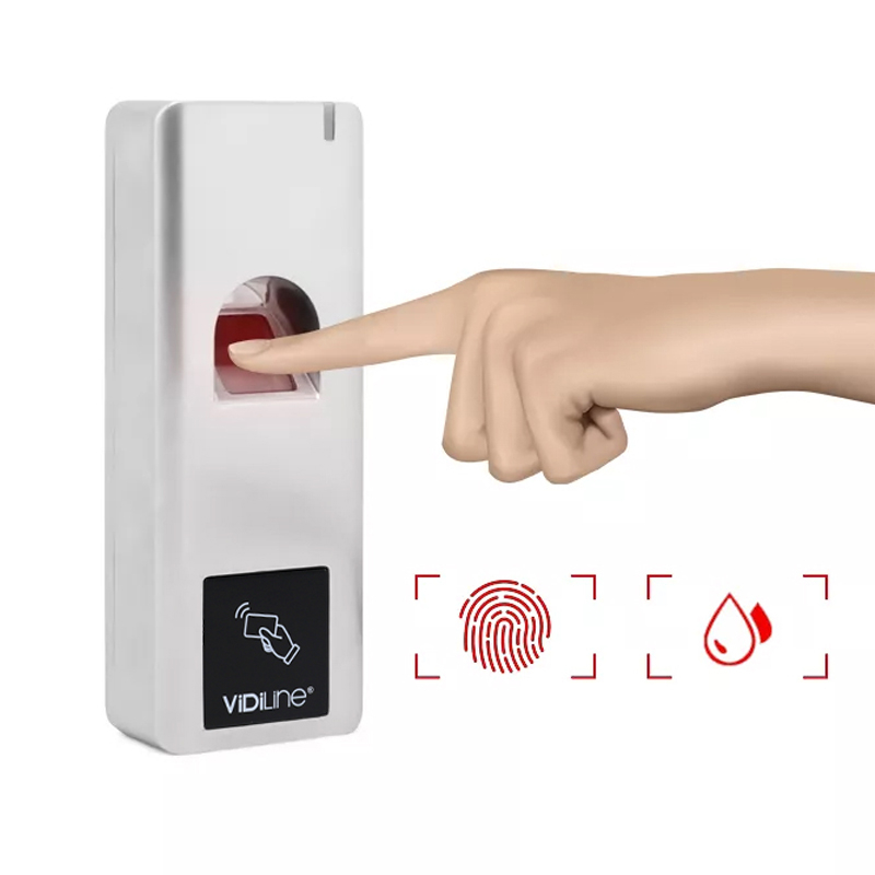 VIDI-AC-F007 - wodoodporny metalowy autonomiczny czytnik linii papilarnych z czytnikiem EM. Dzięki wodoodporności zgodnej z normą IP66, urządzenie idealnie nadaje się do montażu na zewnątrz. Smukła obudowa zapewnia możliwość montażu na futrynie drzwi. Urządzenie obsługuje nawet 1000 odcisków palców i 2000 użytkowników z kartą. Zastosowanie interfejsu Wiegand daje możliwość wykorzystania urządzenia jako czytnika w zestawie firm trzecich.