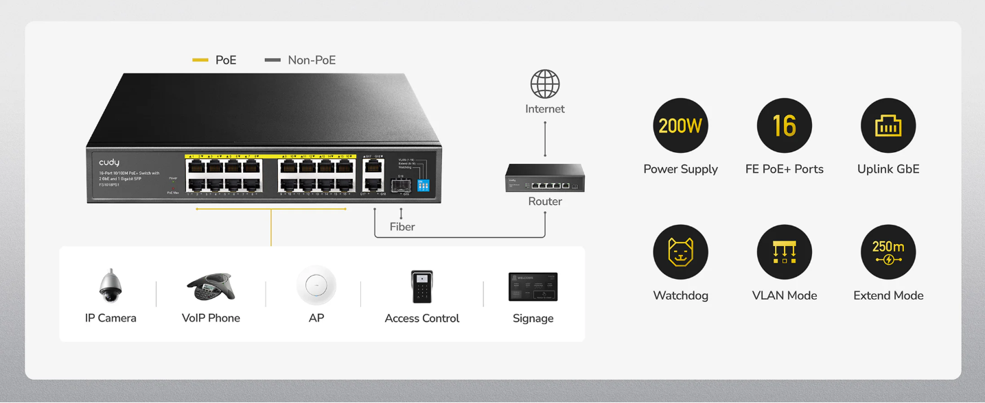 16 Portów PoE z gigantyczną mocą: Urządzenie pozwala zasilić aż 16 kamer IP jednocześnie. Z łącznym budżetem mocy wynoszącym 200W, możesz bez obaw podłączać nawet zaawansowane kamery z mocnymi promiennikami podczerwieni czy funkcją obrotu (PTZ).