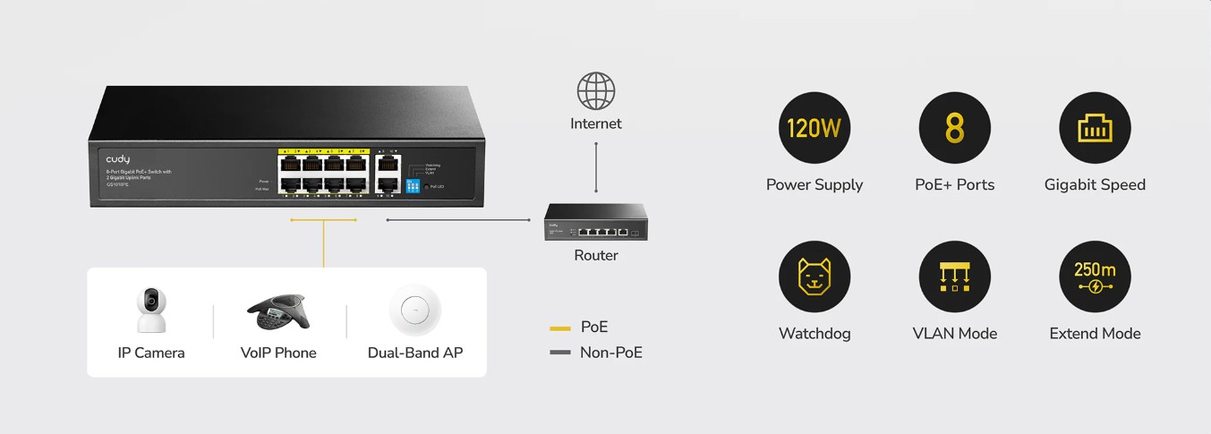 Zasięg do 250 metrów (Tryb Extend): Zapomnij o ograniczeniach. Standardowe switche działają do 100m – Cudy pozwala na montaż kamer nawet na odległych krańcach posesji czy w magazynie.