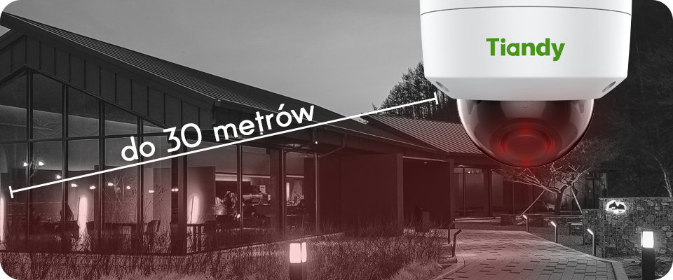 Cztery mocne diody doświetlenia podczerwienią gwarantują zasięg doświetlenia w nocy do 30 m, kamera posiada funkcję automatycznej regulacji mocy doświetlenia w zależności od przybliżenia obrazu, im większe przybliżenie tym większa moc doświetlenia obrazu, dzięki temu sceny bliskie kamerze nie są prześwietlone w nocy, a sceny dalekie na większym zbliżeniu dostatecznie oświetlone.