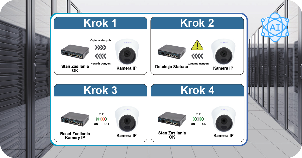 Zaawansowana funkcja monitoruje połączenie sieciowe urządzenia PoE, sprawdzając, czy jest ono aktywne. W przypadku połączenia urządzenia zasilanego przez PoE, Funkcja AI będzie zresetować to urządzenie w przypadku awarii komunikacji w celu przywrócenia funkcjonalności urządzenia.