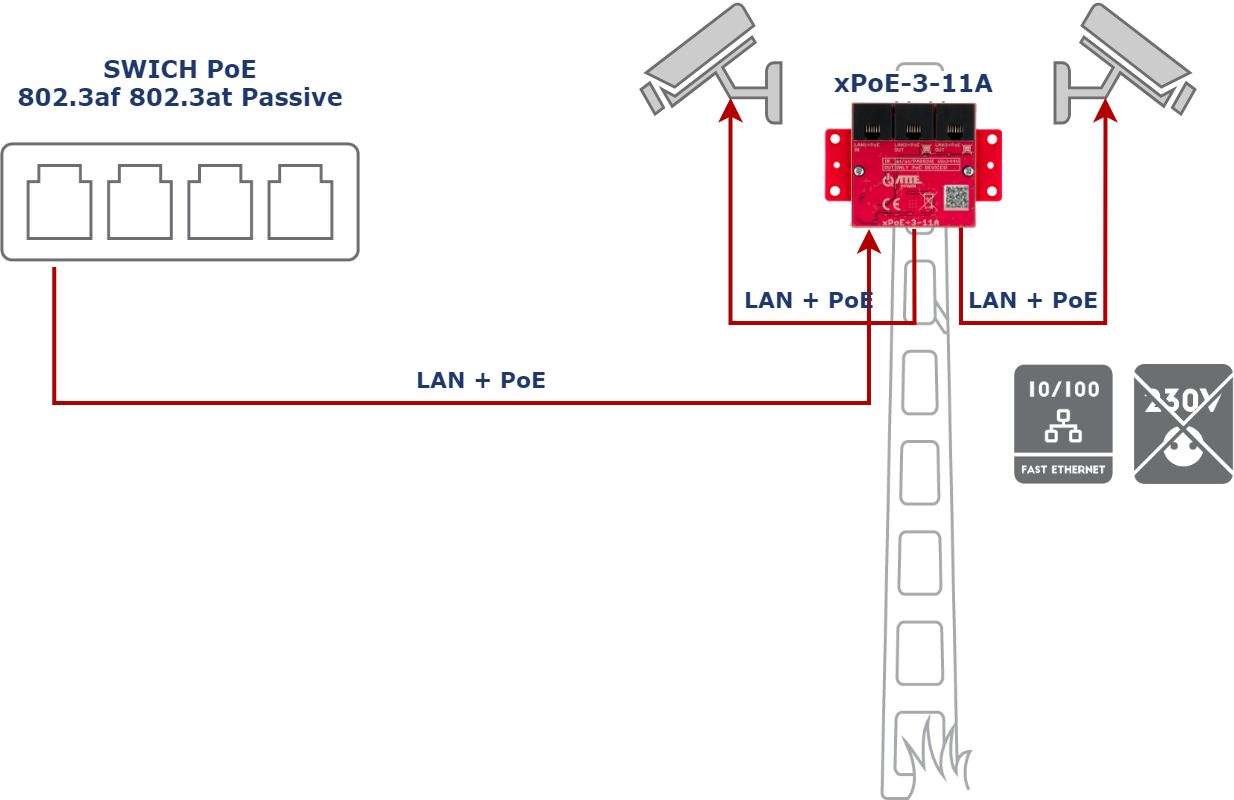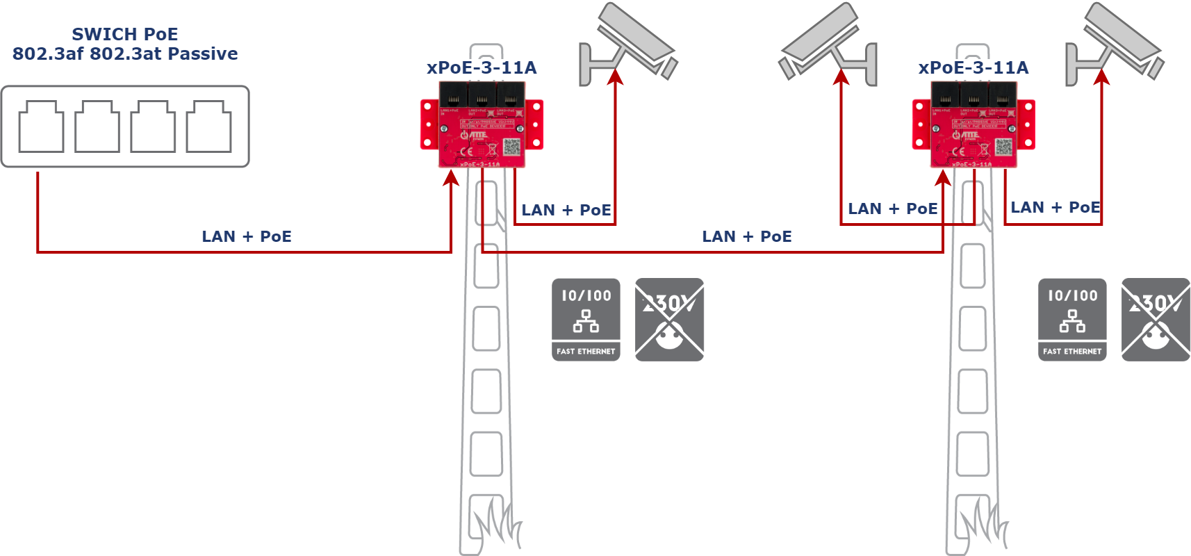 xPoE-3-11A został zaprojektowany jako extender (repeater) sieci LAN oraz zasilania PoE. Regeneruje sygnał sieciowy i przenosi zasilanie PoE na wybrane wyjścia. Najczęściej stosowany jako "wzmacniacz" do przedłużania sieci na odcinkach dłuższych niż 100m. Dodatkowo nadaje się idealnie jako "aktywny rozdzielacz" w sytuacjach, gdy na jednym przewodzie potrzebujemy uruchomić kilka odbiorników PoE (np. kilka kamer IP), lub gdy potrzebujemy stworzyć dodatkowe odgałęzienie sieciowe.