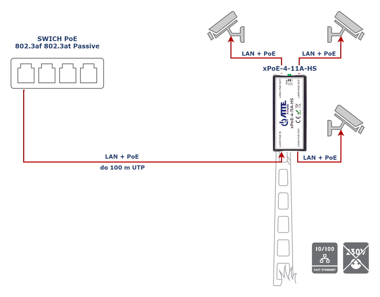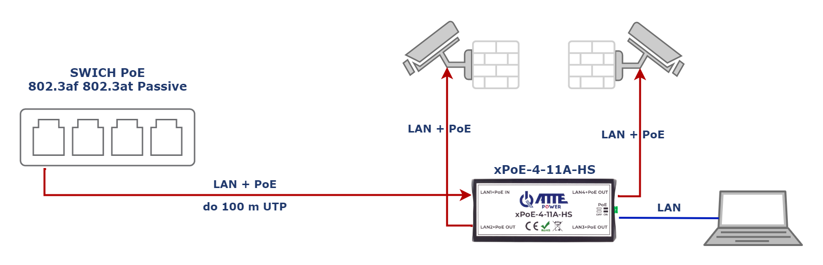 xPoE-4-11A-HS został zaprojektowany jako extender (repeater) sieci LAN oraz zasilania PoE. Regeneruje sygnał sieciowy i przenosi zasilanie PoE na wybrane wyjścia. Najczęściej stosowany jako "wzmacniacz" do przedłużania sieci na odcinkach dłuższych niż 100m. Dodatkowo nadaje się idealnie jako "aktywny rozdzielacz" w sytuacjach, gdy na jednym przewodzie potrzebujemy uruchomić kilka odbiorników PoE (np. kilka kamer IP), lub gdy potrzebujemy stworzyć dodatkowe odgałęzienie sieciowe.
