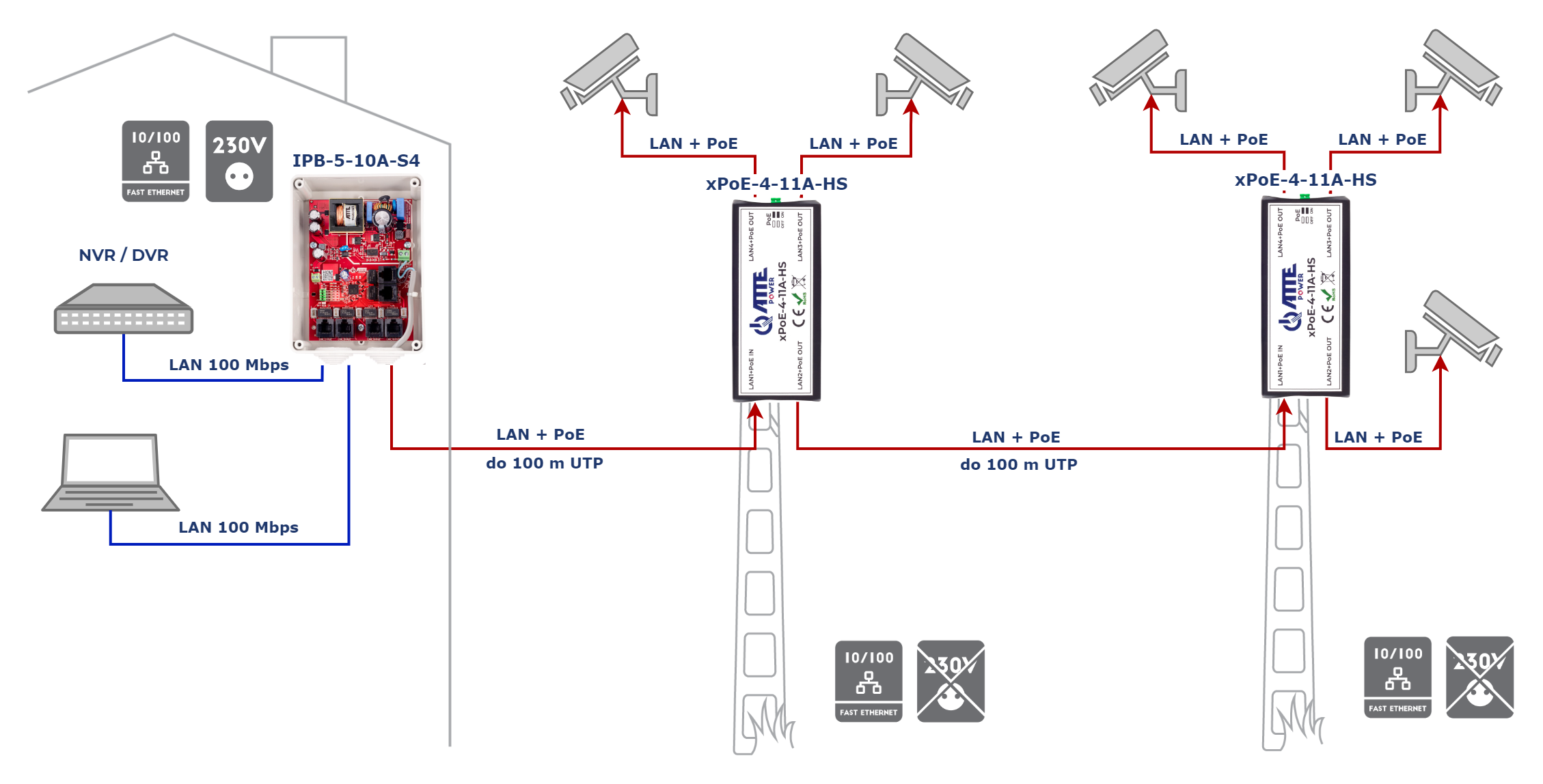 Przykład zastosowania xPoE-4-11A-HS jako ekstender sieci LAN