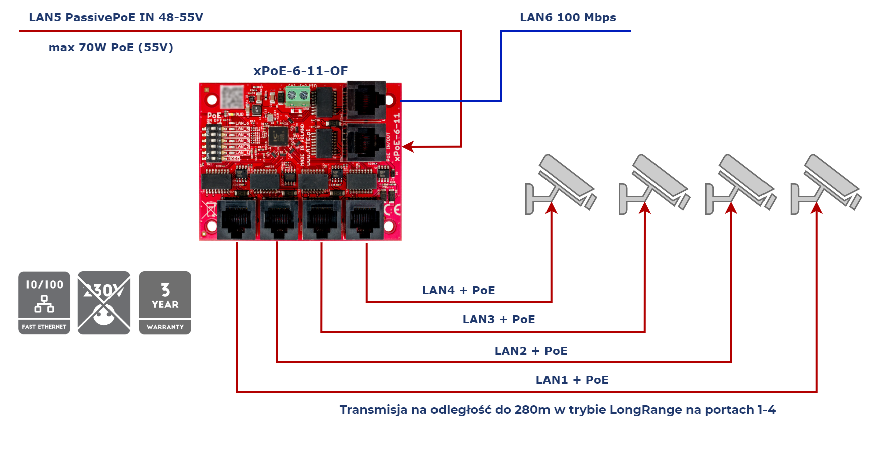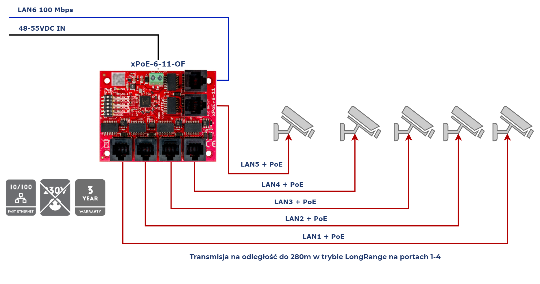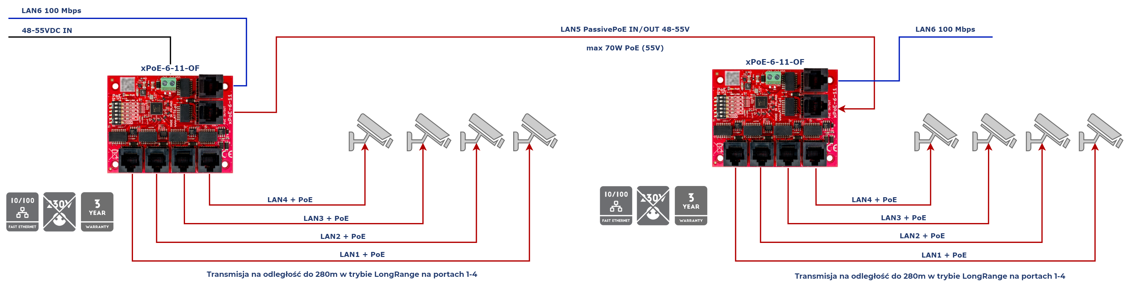 xPoE-6-11-OF został zaprojektowany jako uniwersalny przełącznik sieciowy PoE dedykowany do systemów telewizji przemysłowej IP. Elektroniczne zabezpieczenia wyjść PoE zapewniają ciągłość pracy całego systemu przy zwarciu lub przeciążeniu pojedynczych gałęzi zasilania oraz automatyczny powrót napięcia po ustąpięniu awarii. Niezarządzalne switche i extendery PoE przeznaczone są do współpracy z kamerami IP oraz innymi urządzeniami sieciowymi zasilanymi w standardzie PoE 802.3at/af oraz PoE PASSIVE.