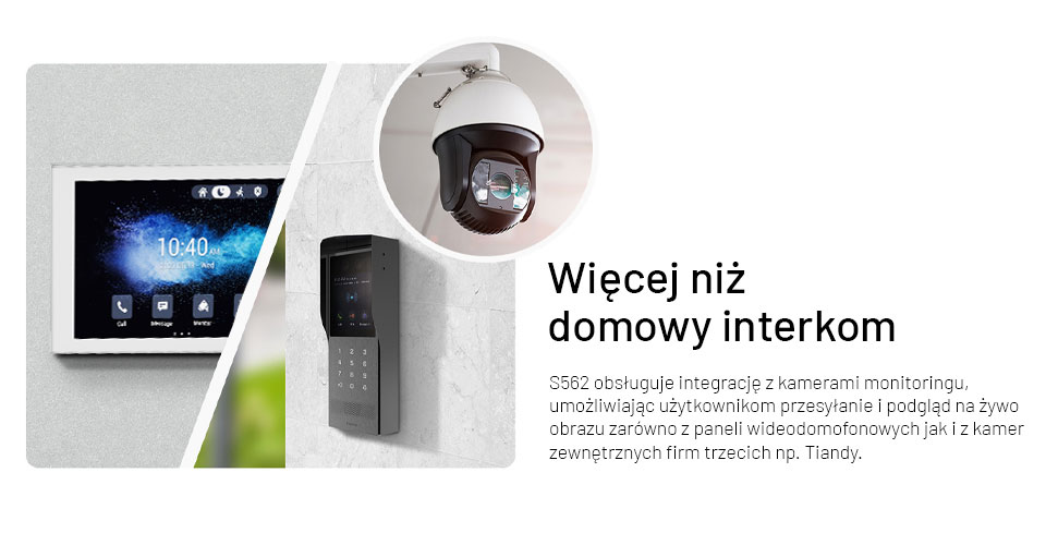 To jednak więcej niż tylko domowy interkom. S562 obsługuje integrację z kamerami monitoringu, umożliwiając użytkownikom przesyłanie i podgląd na żywo obrazu zarówno z paneli wideodomofonowych, jak i z kamer zewnętrznych firm trzecich, takich jak Tiandy.