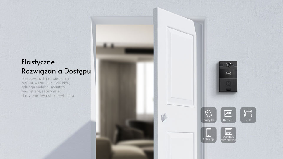 Obsługiwanych jest wiele opcji wejścia, w tym karty IC/ID NFC, aplikacja mobilna i monitory wewnętrzne zapewniając elastyczne i wygodne rozwiązania.